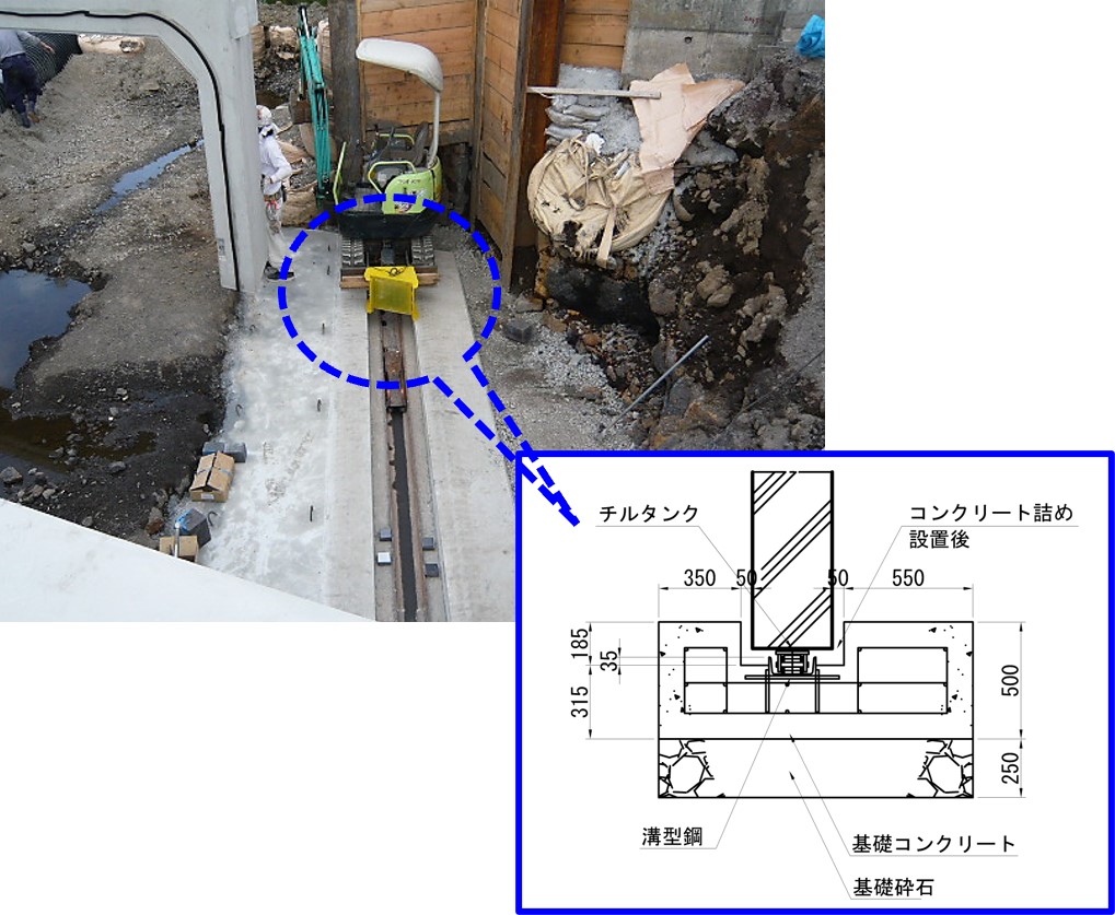 カルバートは10.9t/本あるためクレーンの届かない部分は「ローラースライド工法」で横引をして所定位置まで搬送、設置しました。